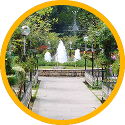 A beautifully landscaped garden with vibrant flowers, lush lawns, and a small amusement park, ideal for picnics and leisurely walks.